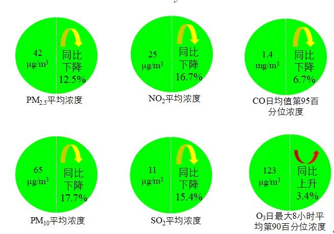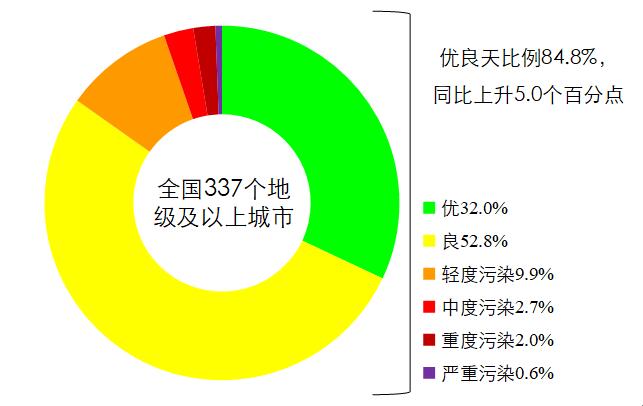 1-4月,全國(guó)337個(gè)地級(jí)及以上城市平均優(yōu)良天數(shù)比例為84.8%,同比上升5.0個(gè)百分點(diǎn);129個(gè)城市環(huán)境空氣質(zhì)量達(dá)標(biāo),同比增加26個(gè);PM2.5濃度為42微克/立方米,同比下降12.5%;PM10濃度為65微克/立方米,同比下降17.7%;O3濃度為123微克/立方米,同比上升3.4%;SO2濃度為11微克/立方米,同比下降15.4%;NO2濃度為25微克/立方米,同比下降16.7%;CO濃度為1.4毫克/立方米,同比下降6.7%。